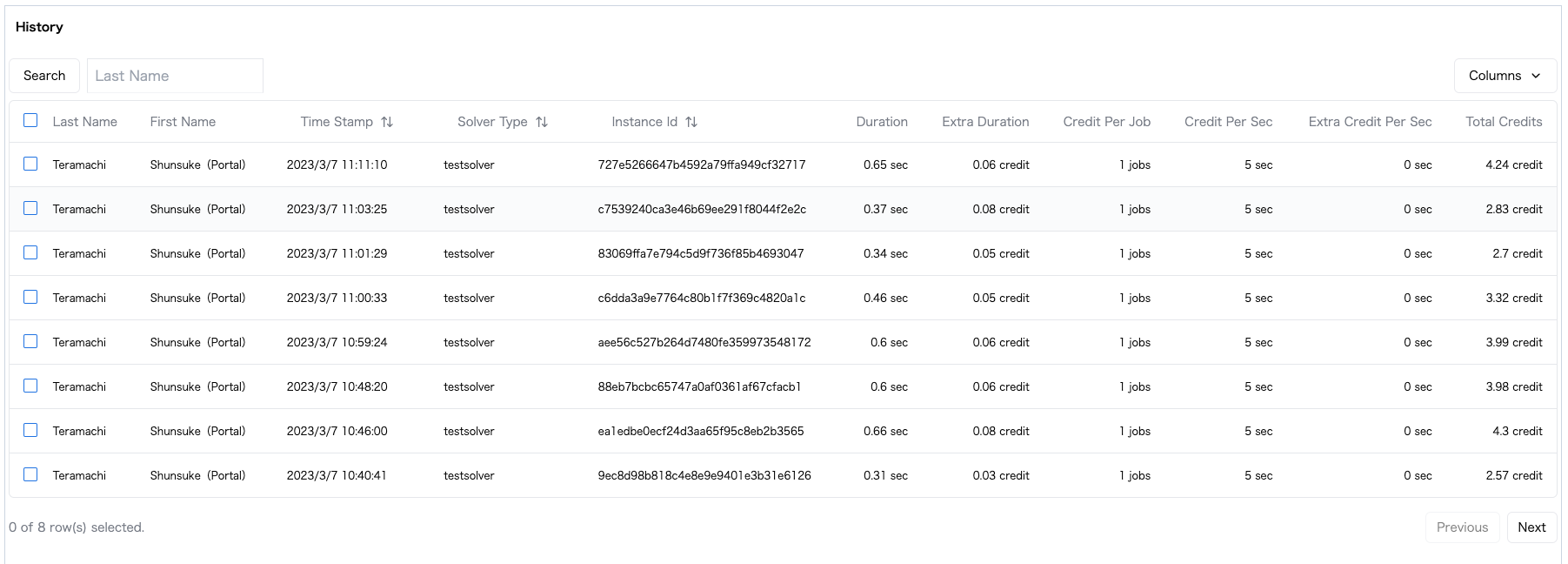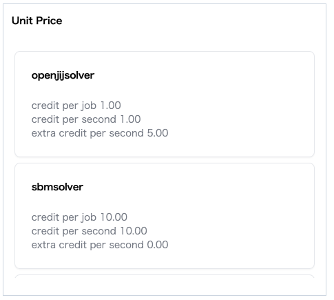 If you can look the "Unit Price" section in "Product" page, you can obtain information on credit_per_job, credit_per_sec, and extra_credit_per_sec of the solver.